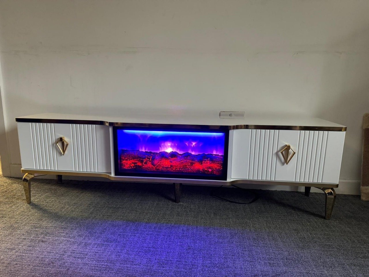 Elevate your living room with the AuroraWhite TV Unit by Mairaaki. This sleek white TV console features gold metallic legs, geometric gold handles, and a built-in electric fireplace for a warm, inviting glow. With two spacious cabinets and a compact size of 160 x 40 cm, it offers both style and smart storage. Designed for modern homes, this piece combines beauty, function, and signature Mairaaki quality.