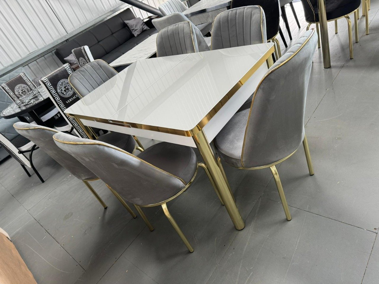 The LineaCraft Dining Set features a sleek white glass table paired with six elegant Star Chairs in white or grey upholstery. Golden metal legs add a touch of modern luxury, making it the perfect blend of style and functionality for any dining space.