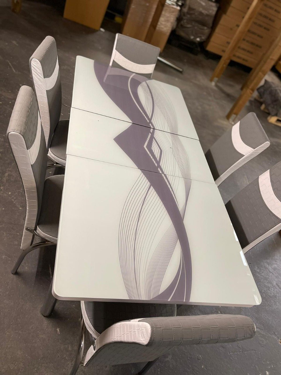 The LumiGlide Dining Table brings modern elegance to your home with its glossy abstract design in gray tones. Paired with six high-back upholstered chairs, it offers both style and comfort. Available exclusively at Mairaaki for contemporary living spaces.
