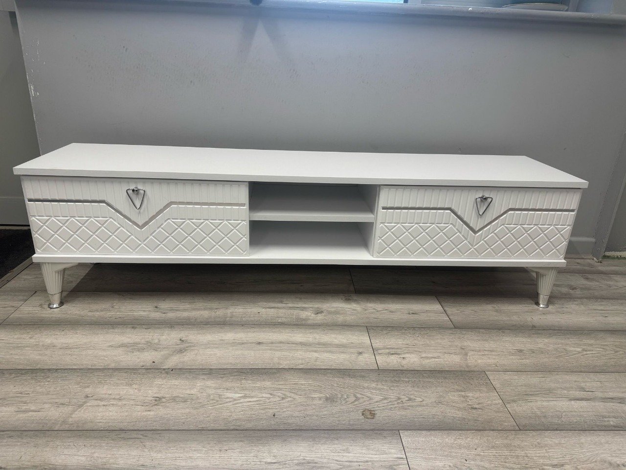 The Velora Classic TV Stand by Mairaaki features a sleek white finish, diamond-textured drawers, and open shelves for stylish, practical storage. Its tapered metallic legs and modern design make it a perfect fit for any contemporary living space.